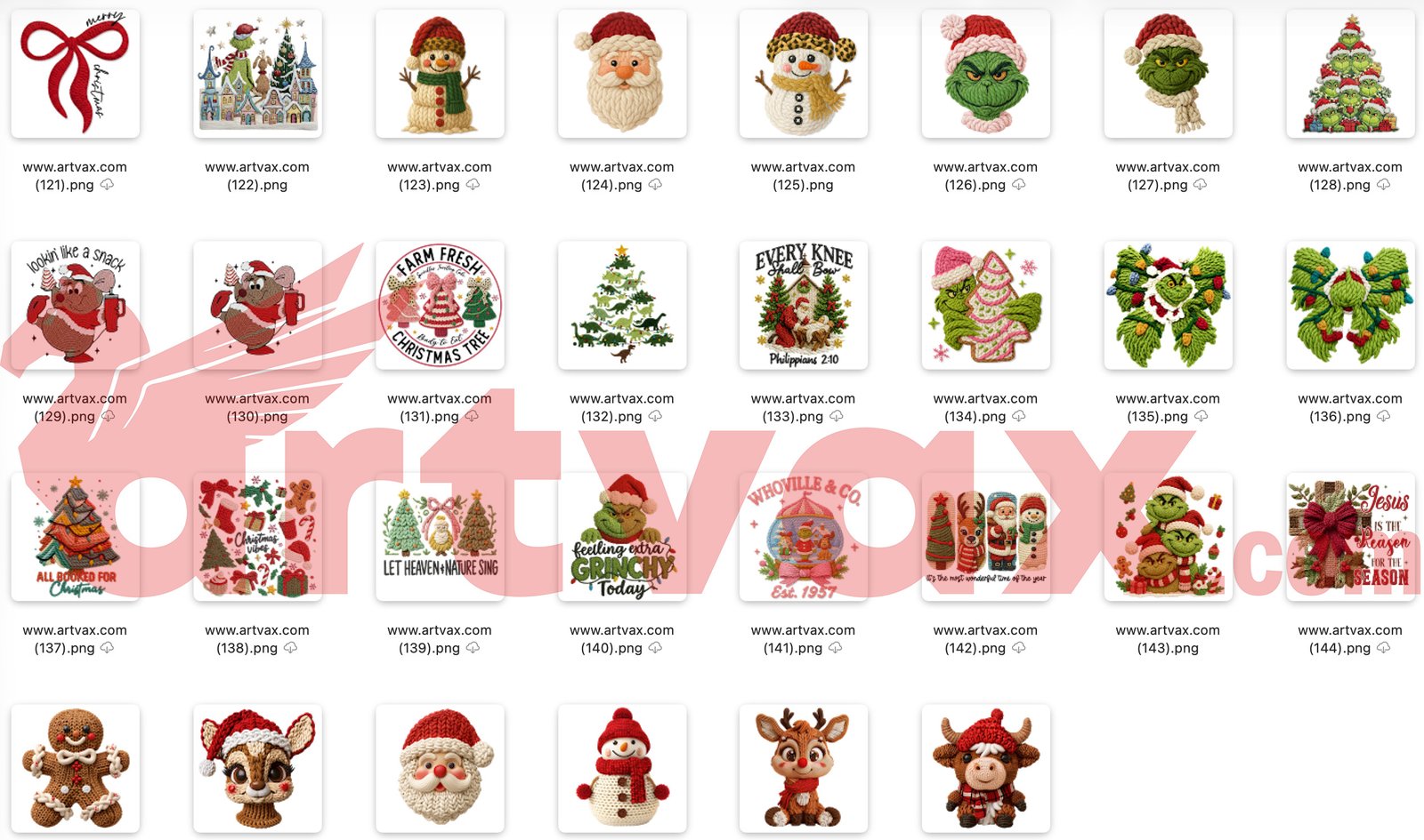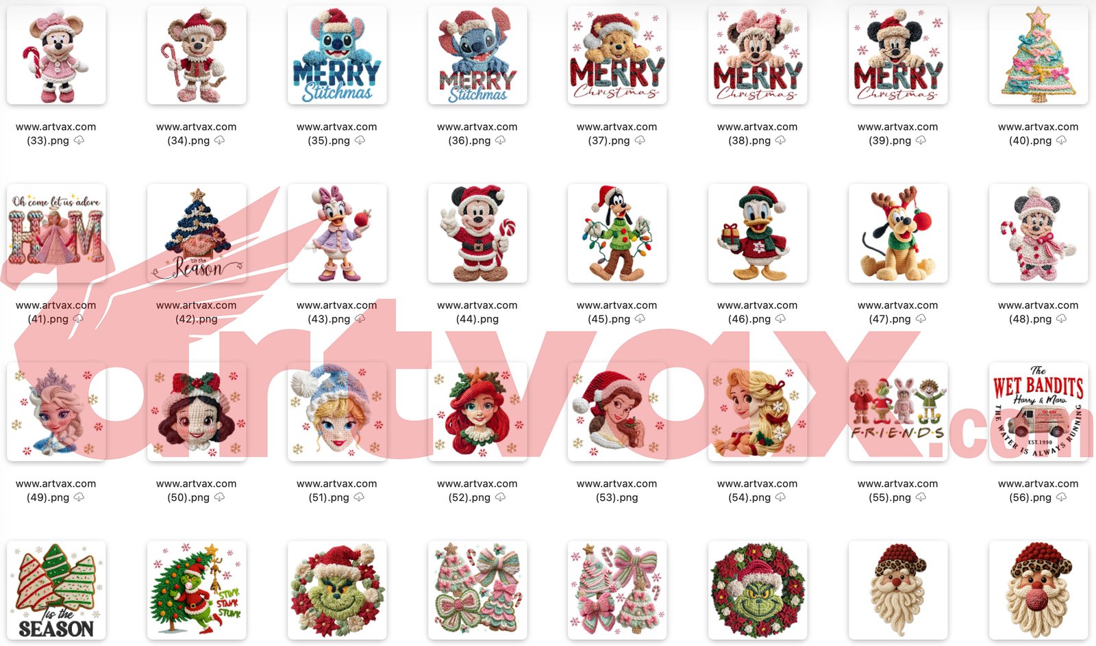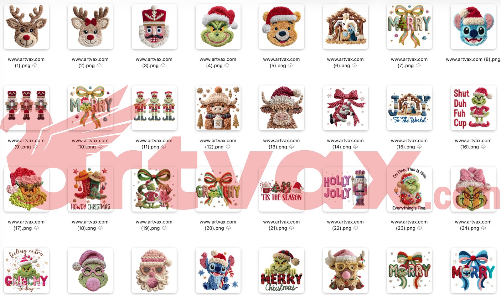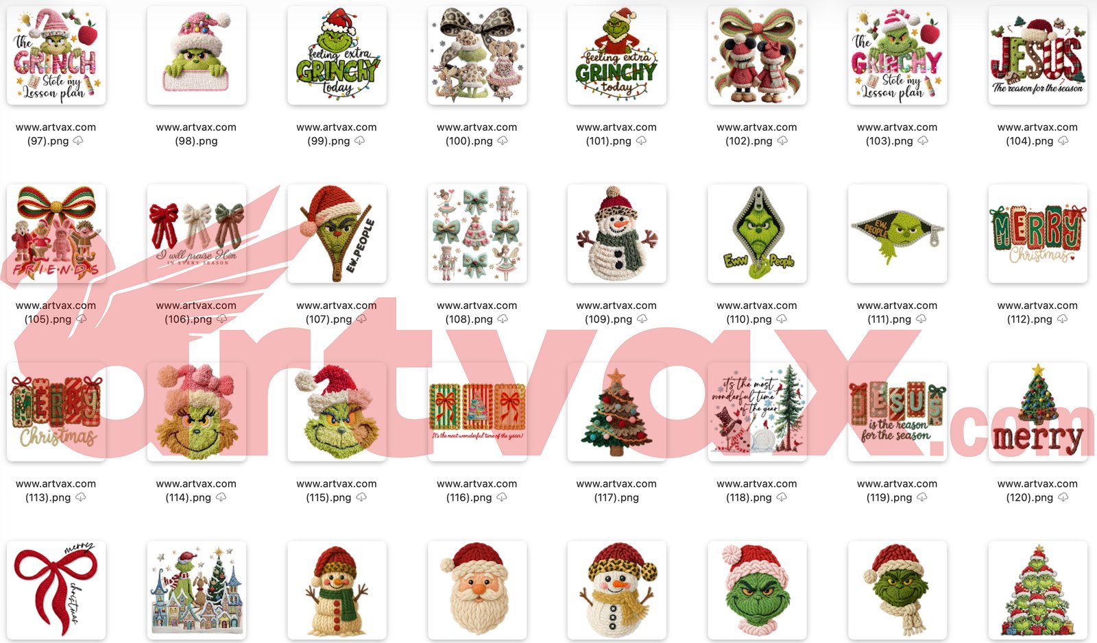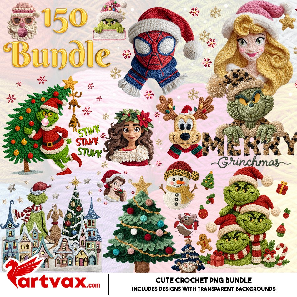 Unlock a massive collection of holiday cheer with the 150 Crochet Christmas PNG Bundle! This unique digital set features popular characters, including the Grinch, Spider-Man, Stitch, Disney Princesses (Aurora, Moana), and festive elements—all meticulously rendered in a beautiful crocheted or knitted style.