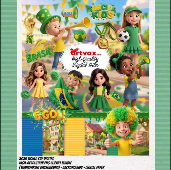 Provided as **high-resolution PNGs with transparent backgrounds**, these files are optimized for a seamless experience in all your sublimation, heat transfer, and digital design projects. The bundle also includes **coordinating digital papers** featuring scenic Brazilian-inspired backgrounds to help you create complete, professional-looking gameday scenes.