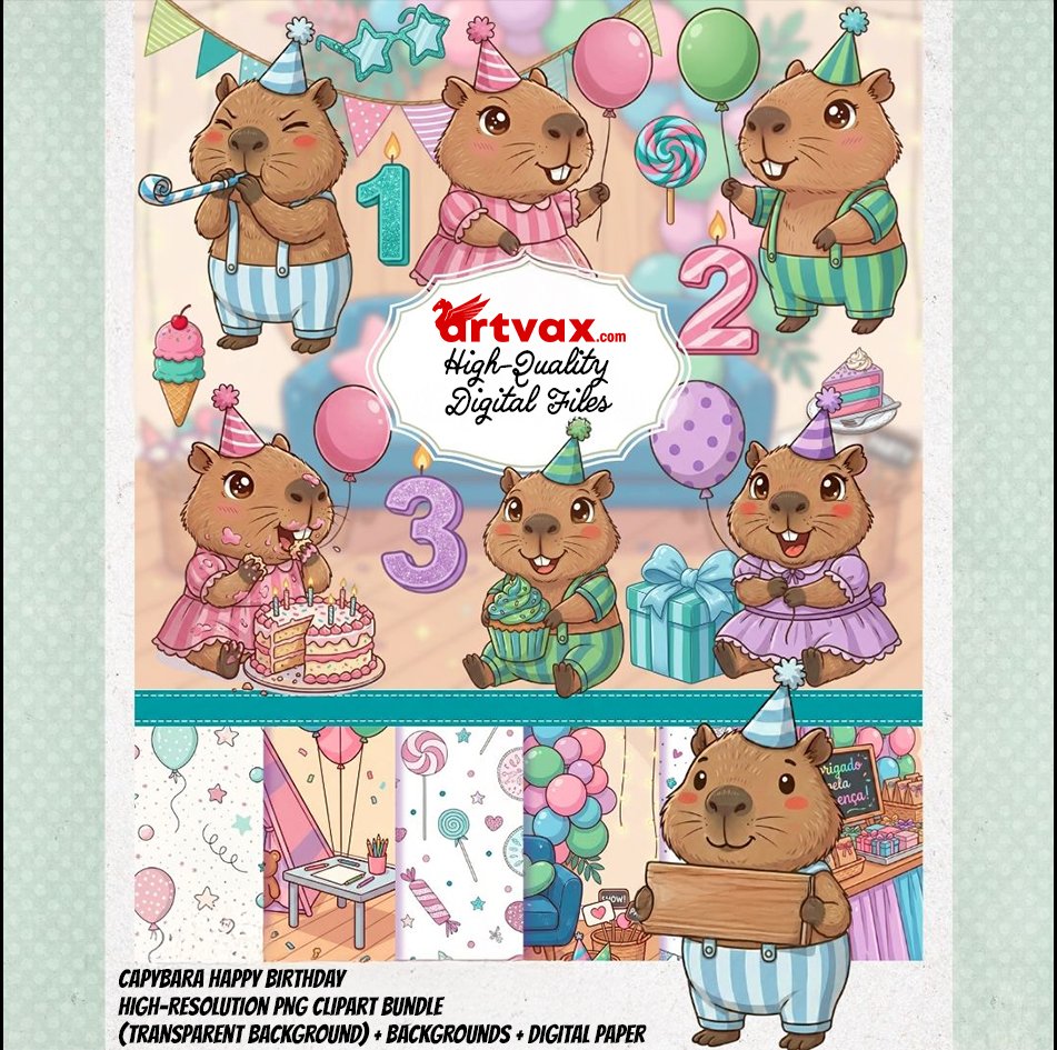 Celebrate your little one's special day with the world's most lovable party animal! This **Capybara Happy Birthday Premium Art Bundle** is a whimsical collection of high-quality digital assets perfect for creating a trendy and adorable birthday celebration. 🎈✨