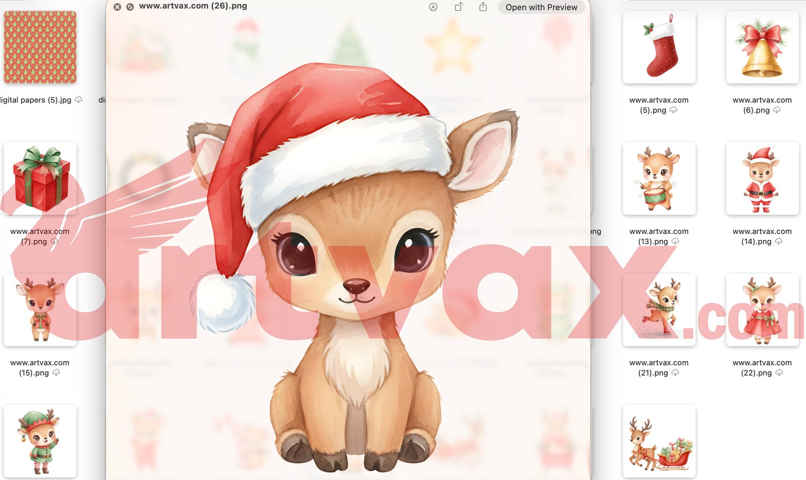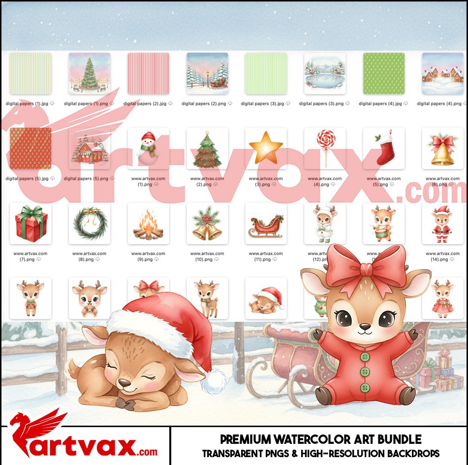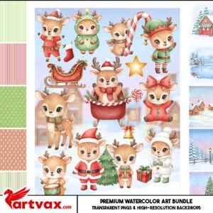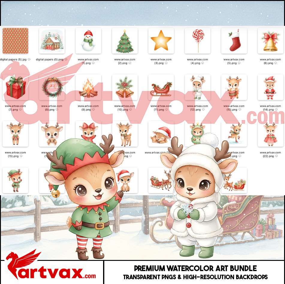 This premium collection features charming **baby deer** dressed as Santa, elves, and snowmen, surrounded by gifts, sleighs, and Christmas trees. All elements are rendered in a soft, **hand-painted watercolor style**, and each file is a high-quality, transparent **PNG**, perfect for layering over any background.