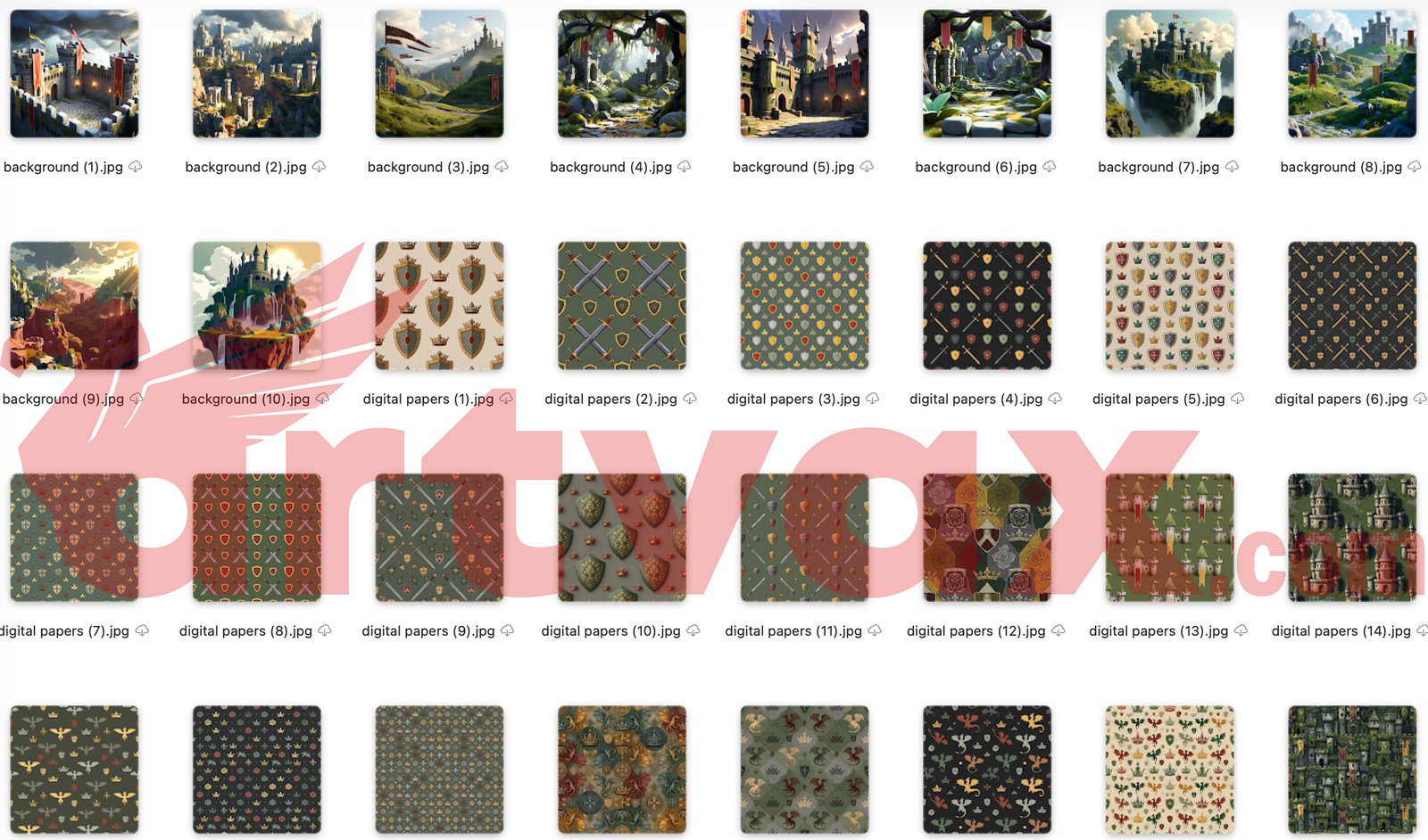 Coordinating Digital Papers: The bundle includes five beautiful background patterns, featuring lush castle landscapes, ancient stone ruins, misty waterfall cliffs, and whimsical medieval crest-and-crown patterns.