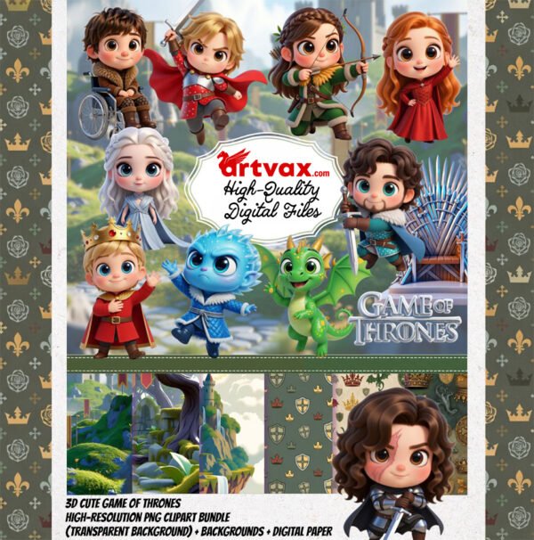 Embark on a legendary creative journey with this **3D Cute Game of Thrones Clipart Bundle**! This high-resolution collection features adorable, high-fidelity reimagining of iconic fantasy heroes and mythical creatures in various adventurous poses, making it the perfect choice for creating professional-quality nursery decor, boutique children's apparel, and personalized gifts for fantasy fans. Whether you are designing for a heroic birthday party or crafting custom stationery, this bundle offers a soft, modern 3D aesthetic that captures the magic of a far-away kingdom. 🏰🐉⚔️