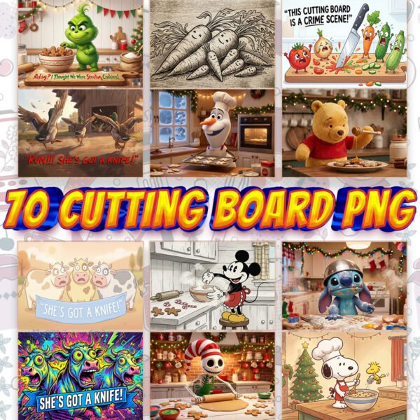 Spice up your kitchen with this hilarious 10 Cutting Board PNG Bundle! This massive digital collection features diverse, high-quality designs perfect for decorating kitchen accessories. Themes range from funny Vegetable Crime Scene and “She’s Got A Knife!” memes to adorable scenes of characters like Mickey Mouse, Stitch, and the Grinch baking!