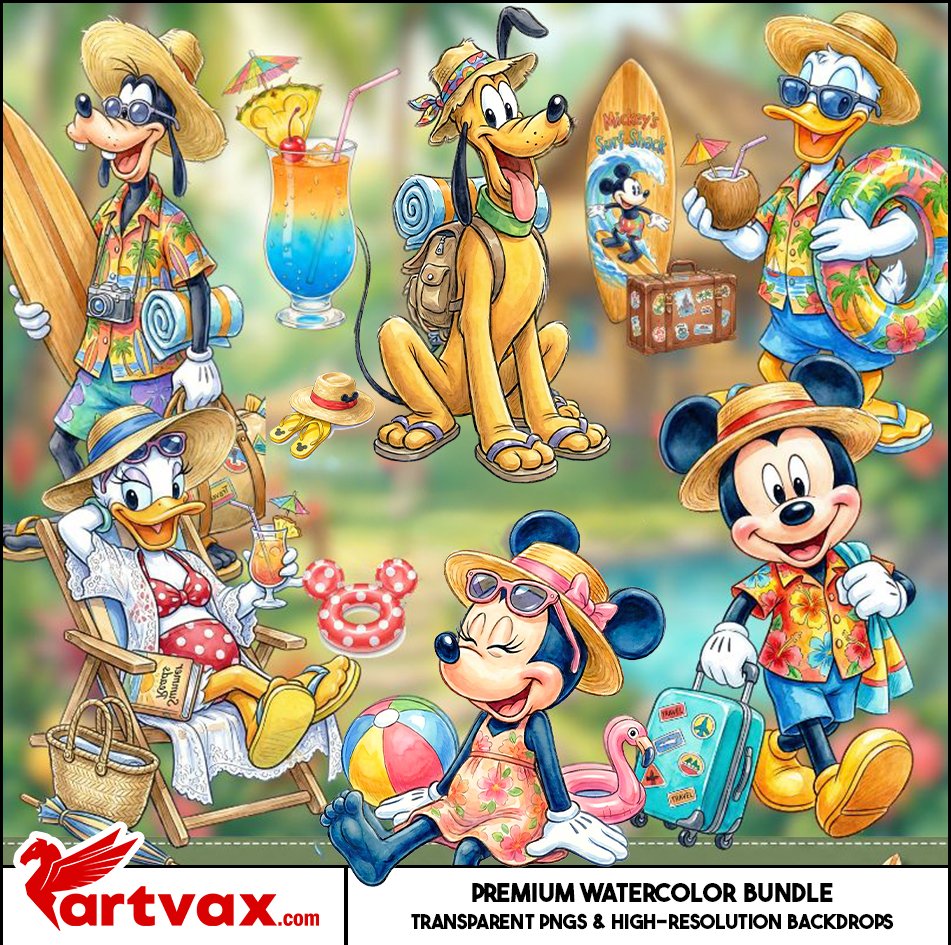 Unique Watercolor Characters: Mickey, Minnie, Donald, Daisy, Goofy, and Pluto in vacation outfits.