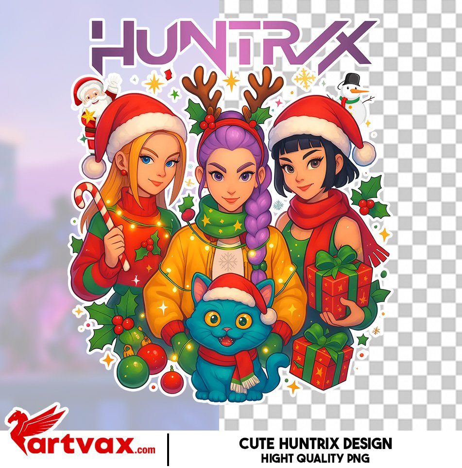 Bring festive charm to your creative projects with this Huntrix Christmas PNG! πβ¨ Perfect for fans of anime and kawaii style, this includes beautifully illustrated Huntrix girls in Christmas outfits with Santa hats, reindeer horns, holiday gifts, and a cute cat companion.
