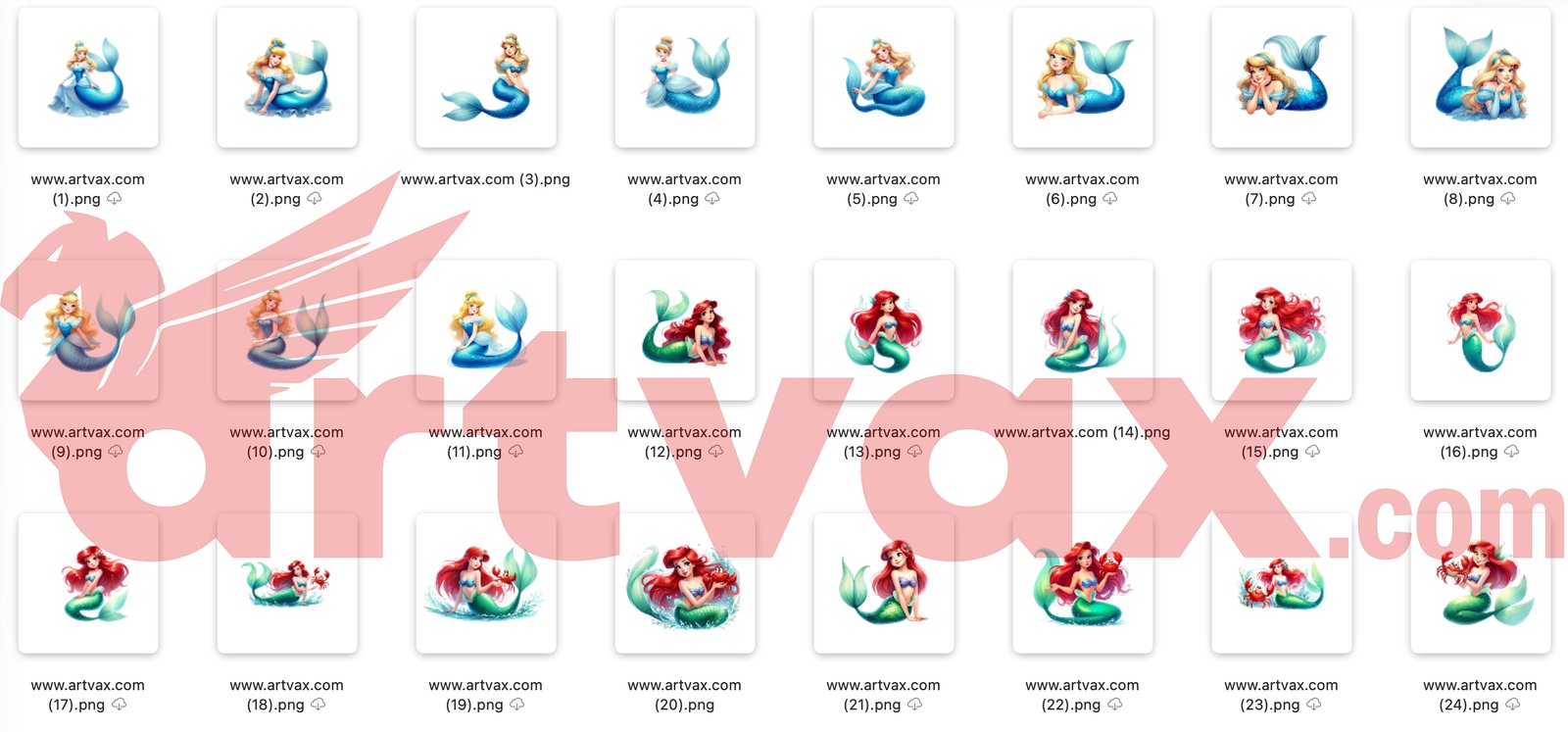 This extensive digital kit includes a variety of beloved characters in vibrant mermaid forms: