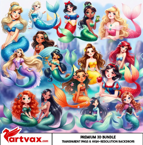 Dive into a world of underwater enchantment with this **Premium Mermaid Princess 3D Bundle**! This high-resolution collection reimagines your favorite fairytale heroines as beautiful mermaids, rendered in a stunning, high-fidelity three-dimensional style. It is the perfect choice for creating professional-quality nursery decor, "Under the Sea" birthday apparel, and magical party stationery. 🧜♀️🐚✨