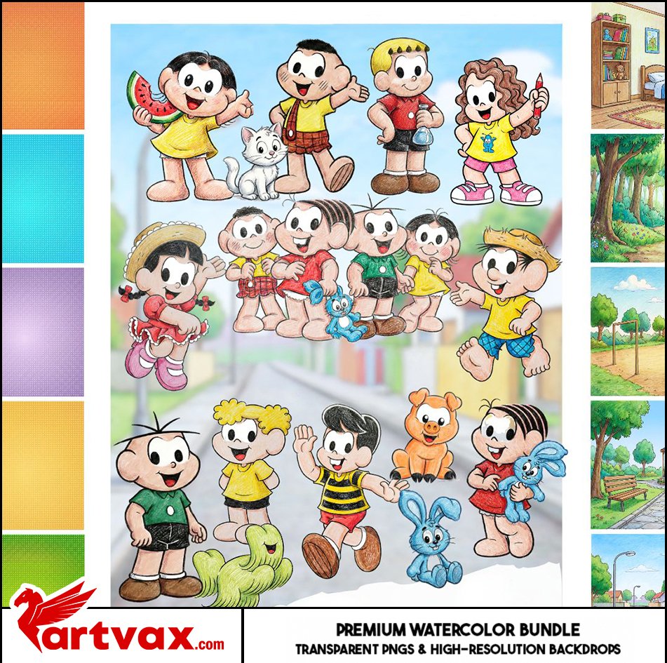 Join the gang for an adventure! Bring the nostalgic charm of the world's most famous Brazilian neighborhood to your creative projects with this beautiful **Monica's Gang Watercolor Clipart Bundle**! ✨