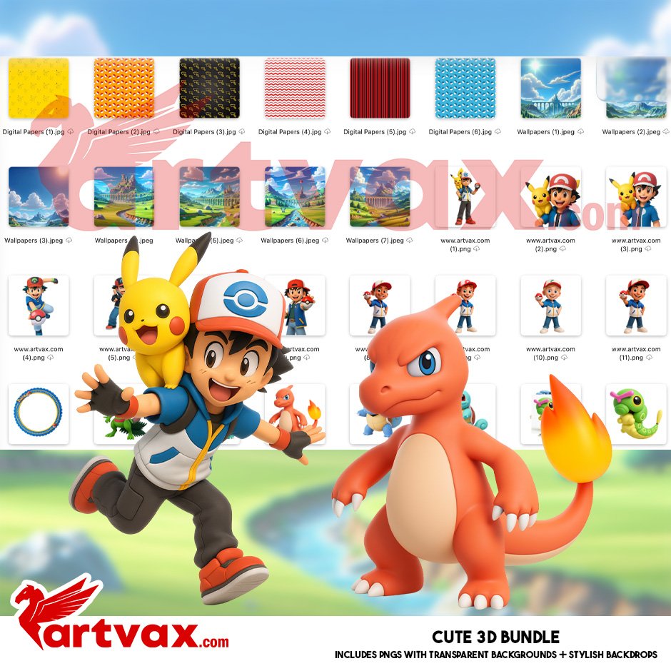 Pokemon Birthday Clipart Bundle | Cute Pikachu & Ash PNG | Digital Backdrops | Kids Party Decor | High-Quality Pokemon PNG Files