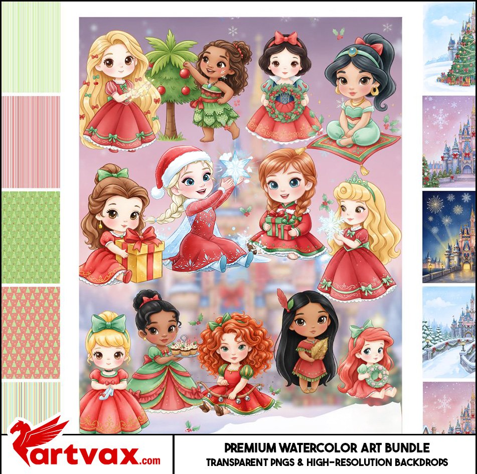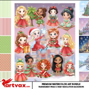 Bring the fairytale magic to your holidays! This festive **Princess Christmas Clipart Bundle** features beautiful Disney Princesses—**Cinderella, Belle, Ariel, Elsa, Jasmine, and Tiana**—all dressed in adorable red and green holiday gowns. Each piece is rendered in a soft, **hand-painted watercolor style**, and all files are high-quality, transparent **PNGs**, perfect for layering over any background.
