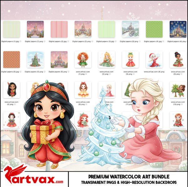 Unique Princess Christmas-themed clipart files (PNG).