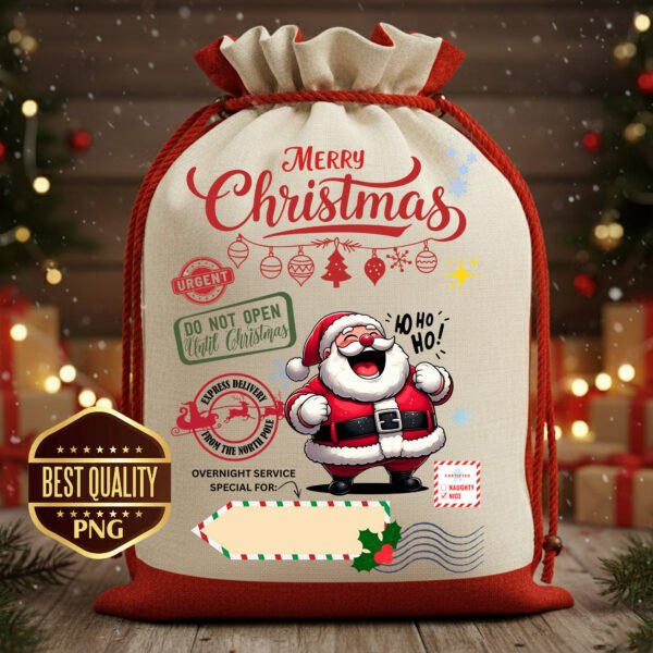 Create a truly memorable Christmas morning with this HIGH QUALITY PNG design! It features a cheerful, classic Santa Claus laughing “HO HO HO!” and is perfectly sized and themed for a Personalized Santa Sack or jumbo gift label. The design includes all the official North Pole sealsโincluding the certified “NICE” list checkmark and “DO NOT OPEN” instructions.
