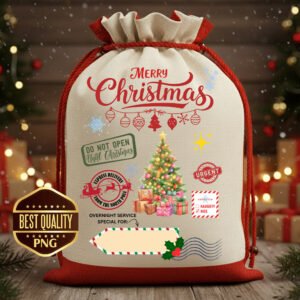 Make Christmas magic with this BEST QUALITY PNG design, perfectly sized and themed for a Personalized Santa Sack or large gift bag! Featuring a festive Christmas Tree surrounded by gifts, plus all the official North Pole stamps—including the certified “NICE” list checkmark and “DO NOT OPEN” instructions.