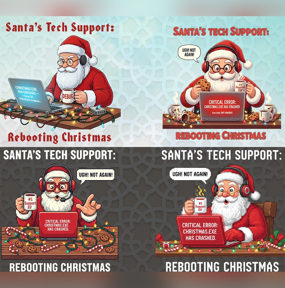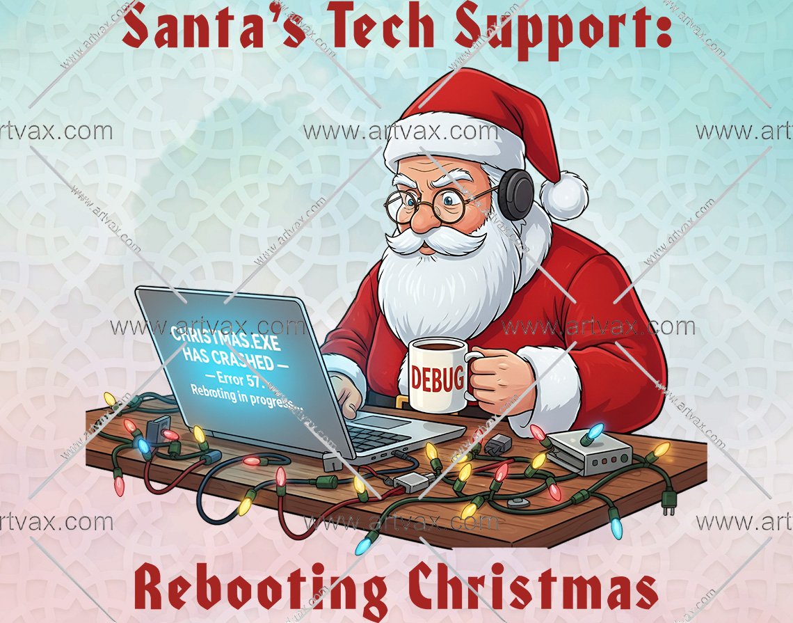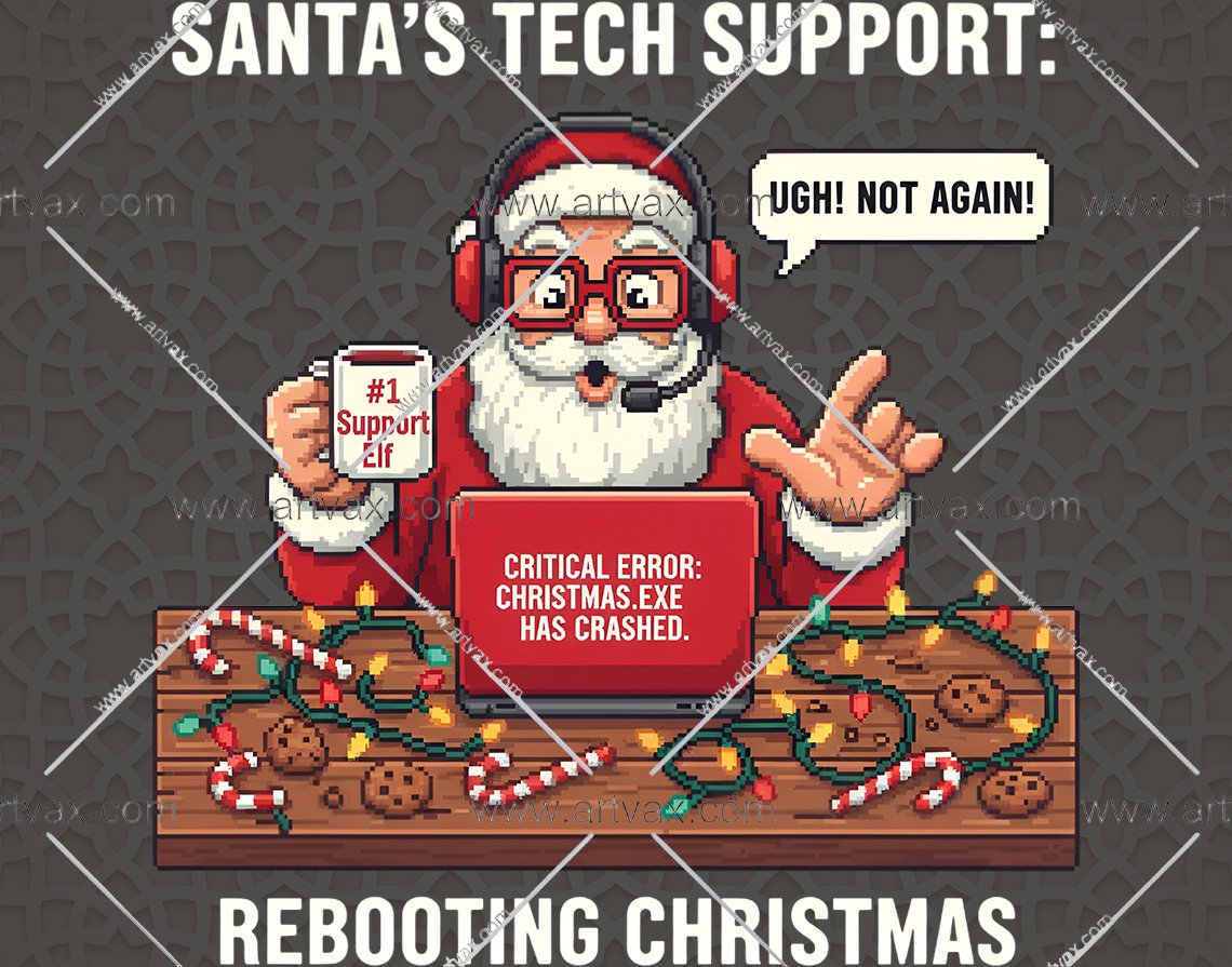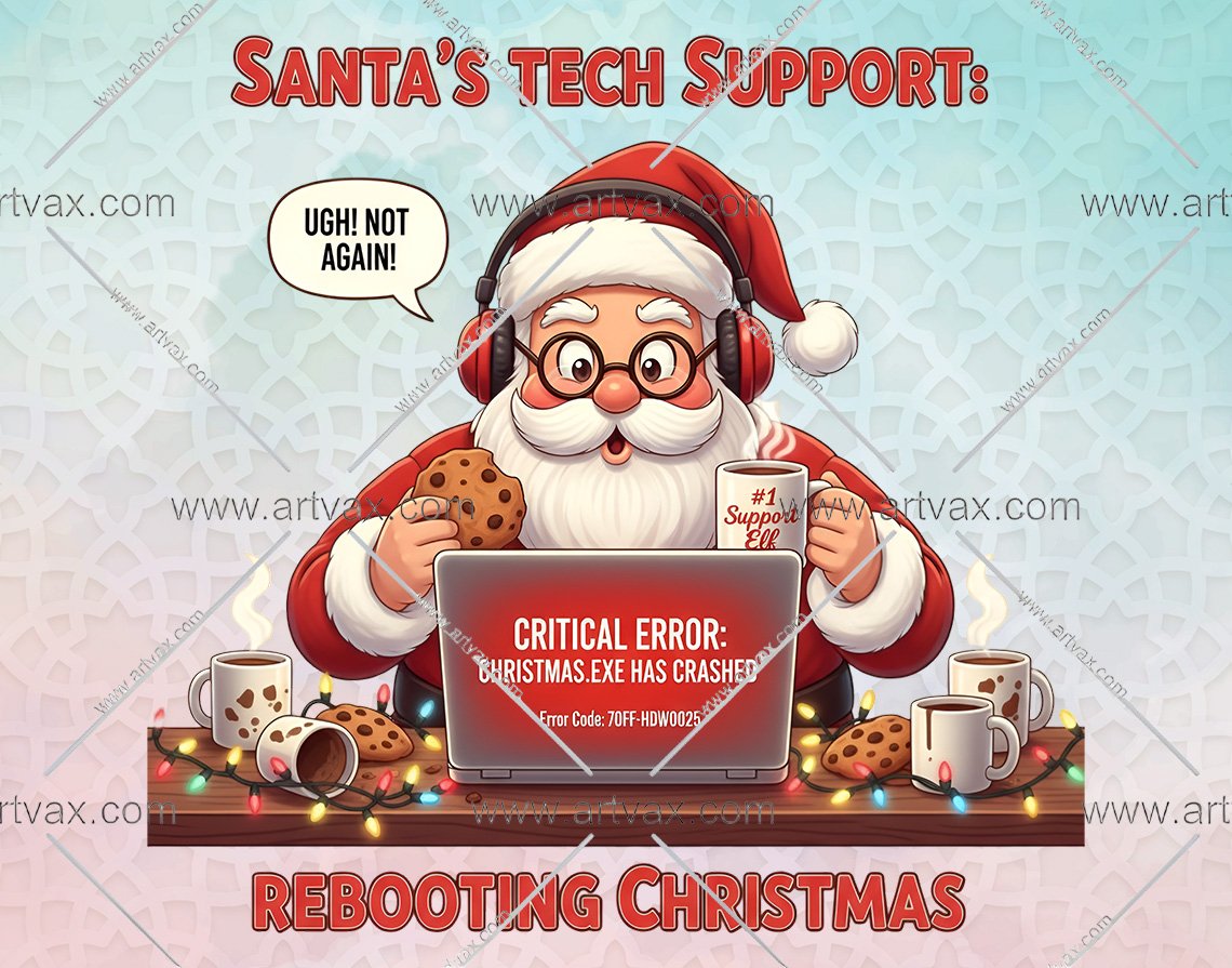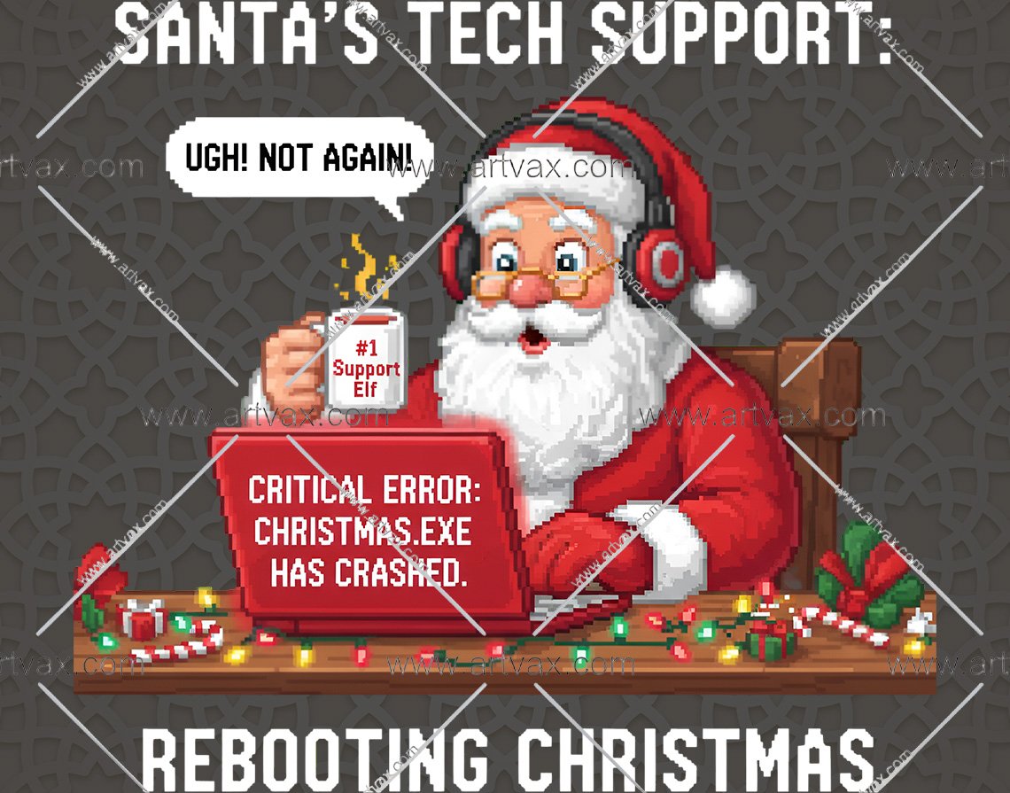 This premium collection features Santa Claus struggling with a "CRITICAL ERROR: CHRISTMAS.EXE HAS CRASHED" on his laptop while wearing a headset. The bundle offers several funny variations on the theme, perfect for those who work in IT or love clever Christmas humor.