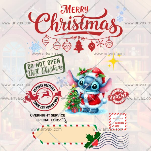 Bring the fun and mischief of a North Pole delivery to your holiday projects! This high-quality PNG design features Stitch dressed as Santa Claus and is perfectly sized for creating a Personalized Santa Sack. The design includes all the official North Pole stamps, like the certified “NICE” list checkmark and “DO NOT OPEN” instructions.
