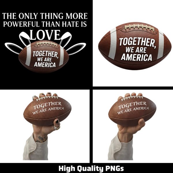 Inspirational Quote Design: Features a striking black-and-white layout with the text “THE ONLY THING MORE POWERFUL THAN HATE IS LOVE” set above a football displaying the “Together, We Are America” slogan.