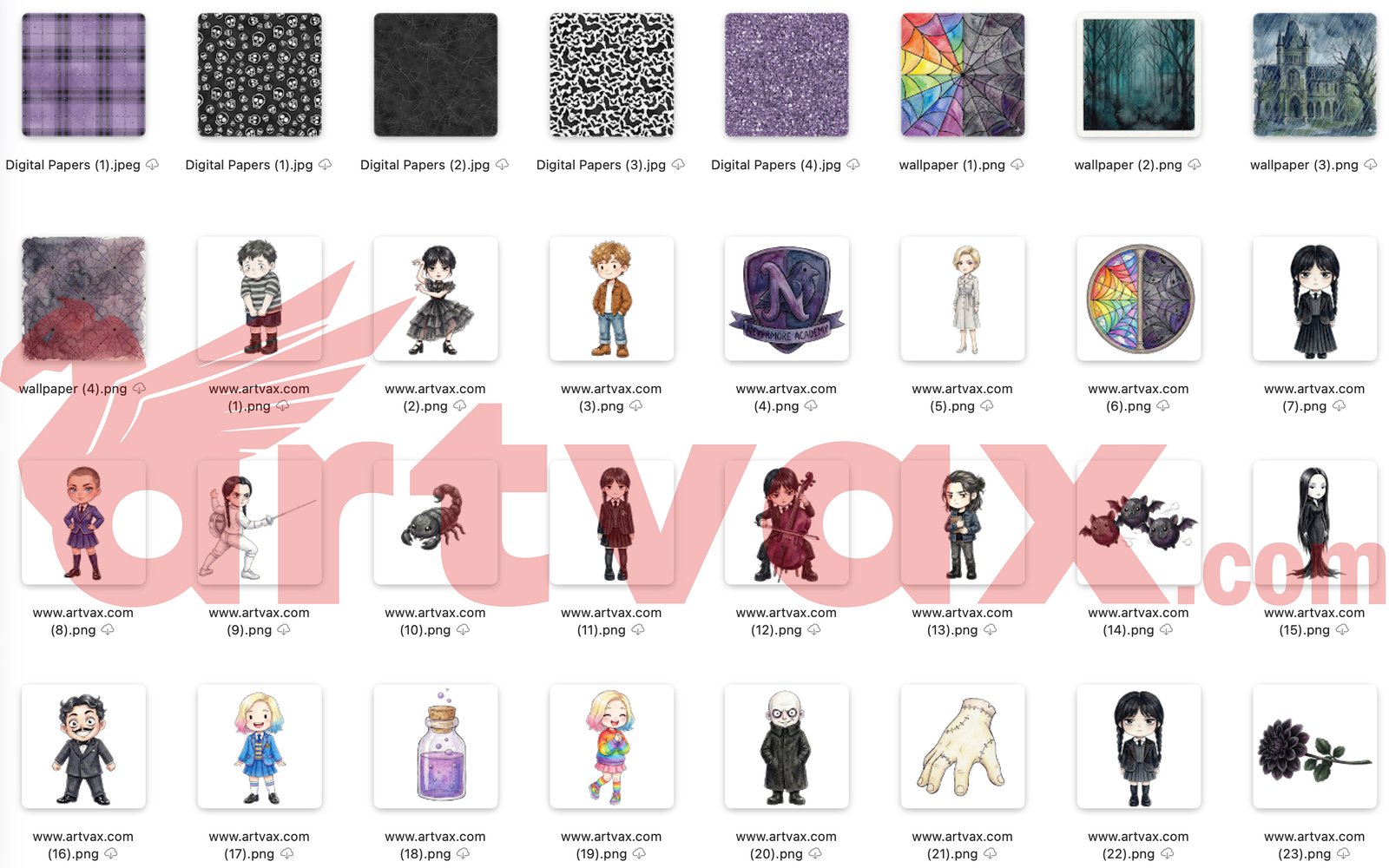 Wednesday Addams Family Clipart Bundle | Chibi Watercolor PNGs | Nevermore Academy Characters & Spooky Backdrops
